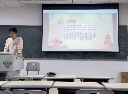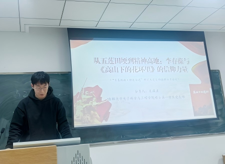 入党积极分子王泽渌以《从五莲田埂到精神高地:李存葆与〈高山下的花环〉里的信仰力量》为题进行分享。他从红色文学作品入手,结合作者李存葆的创作背景,生动讲述了作品中蕴含的革命理想和牺牲精神。通过文学与时代背景的结合,王泽渌同学引导大家深刻认识红色文化在新时代青年思想成长中的重要作用,进一步坚定了理想信念,增强了精神认同。