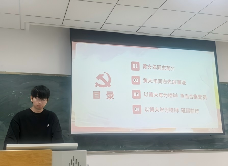 入党积极分子曹恒源以《学习贯彻黄大年精神,做合格共产党员》为主题作党课分享。他围绕黄大年同志“心有大我、至诚报国”的先进事迹,系统阐释了新时代科研工作者应具备的家国情怀和奉献精神,并结合自身科研学习实际,深入剖析了黄大年精神在当代青年科研群体中的现实意义。曹恒源同学表示,作为研究生,应将严谨治学与使命担当统一起来,在服务国家重大战略需求中实现人生价值。